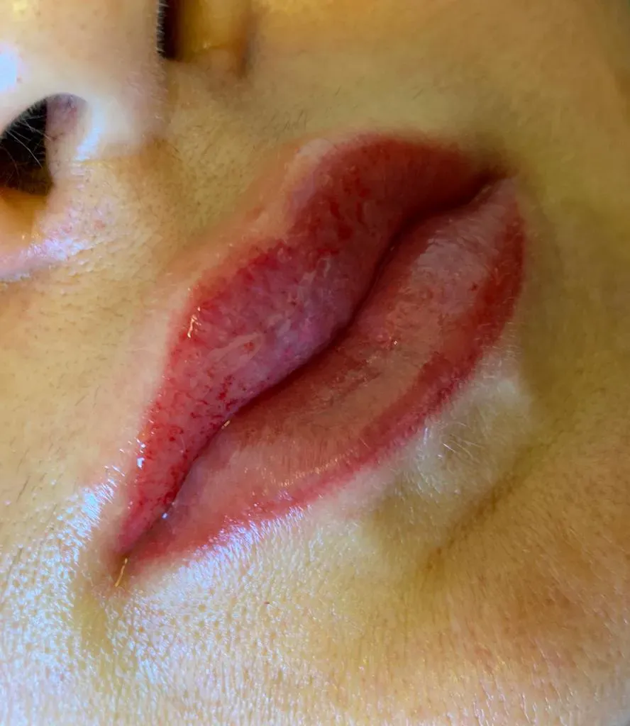 Nahaufnahme der Lippen einer Person, die geschwollen und gequetscht aussehen, mit sichtbaren Rötungen und leichten Verfärbungen um den Bereich herum. Das Bild hebt die Textur und Farbe der Lippen und der Haut hervor.