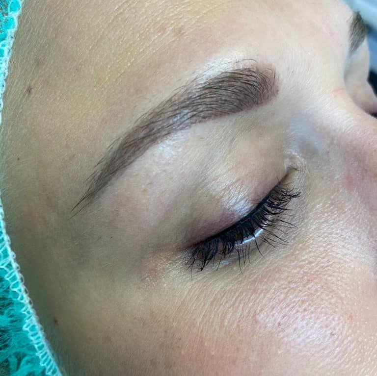 Nahaufnahme des geschlossenen Auges einer Person. Man sieht gepflegte Augenbrauen und lange Wimpern. Die Haut erscheint glatt und auf der linken Seite des Bildes ist teilweise eine grüne OP-Haube zu sehen.